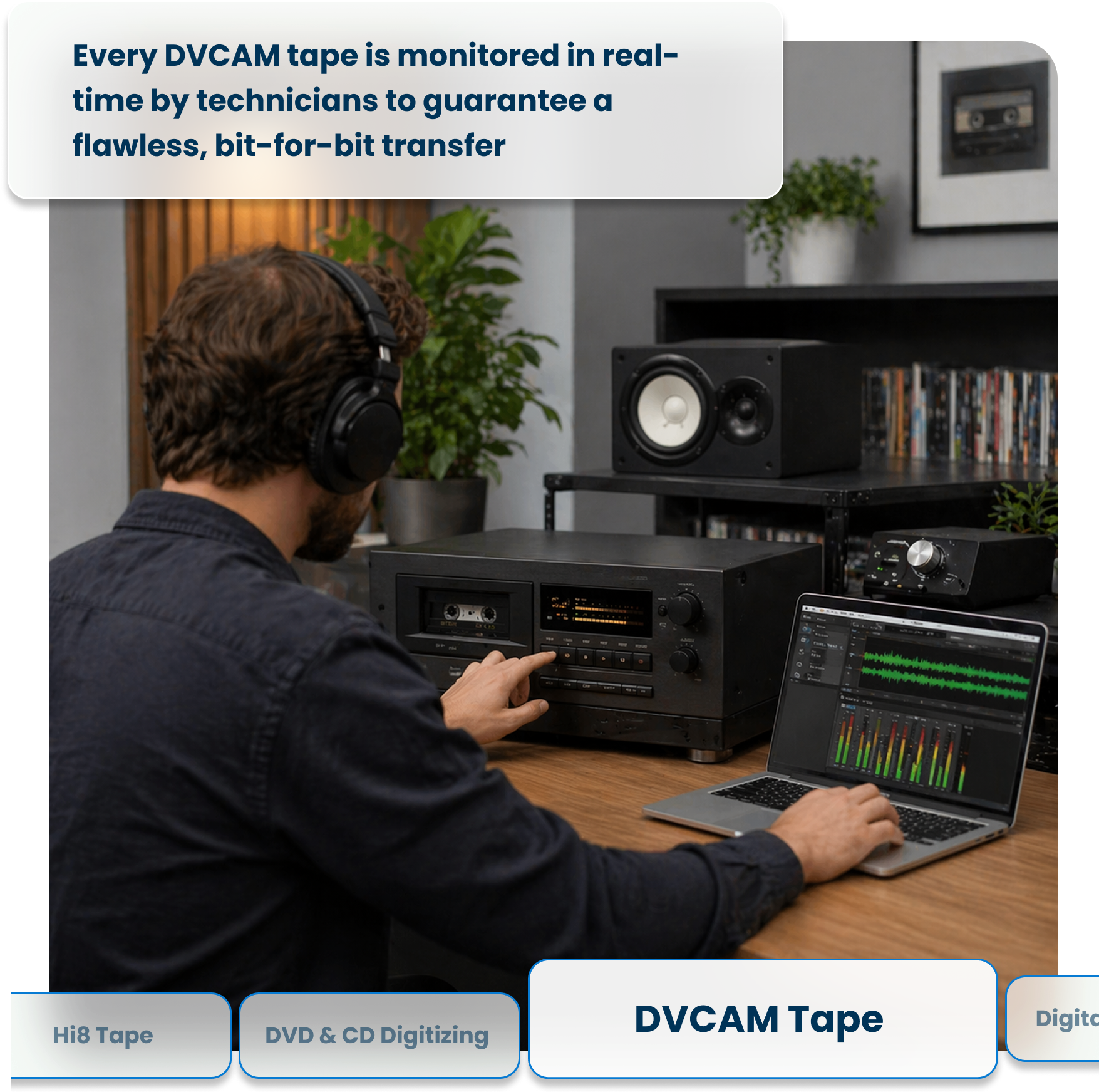 Because DVCAM is a native digital format, transfers via FireWire are lossless — you receive a bit-for-bit copy of the original tape's digital content. Our technicians review every tape before playback and monitor output in real time to ensure the best possible result.