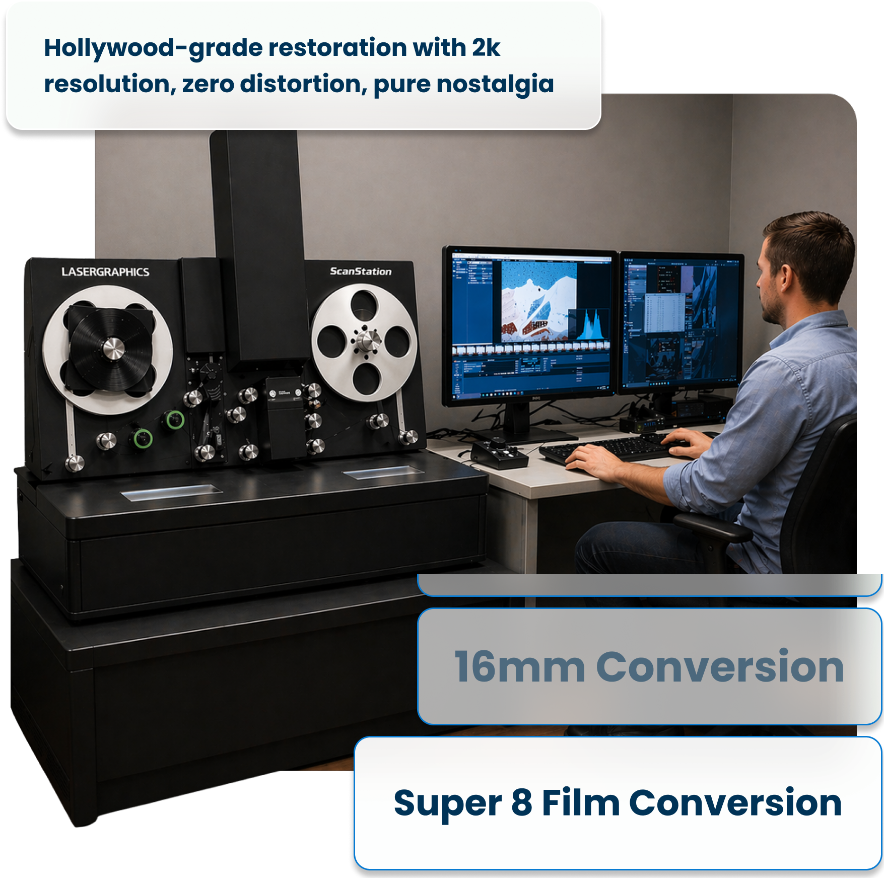 Maximum resolution with professional ProRes or DPX output. For filmmakers, collectors, and institutions who want the absolute highest fidelity transfer.