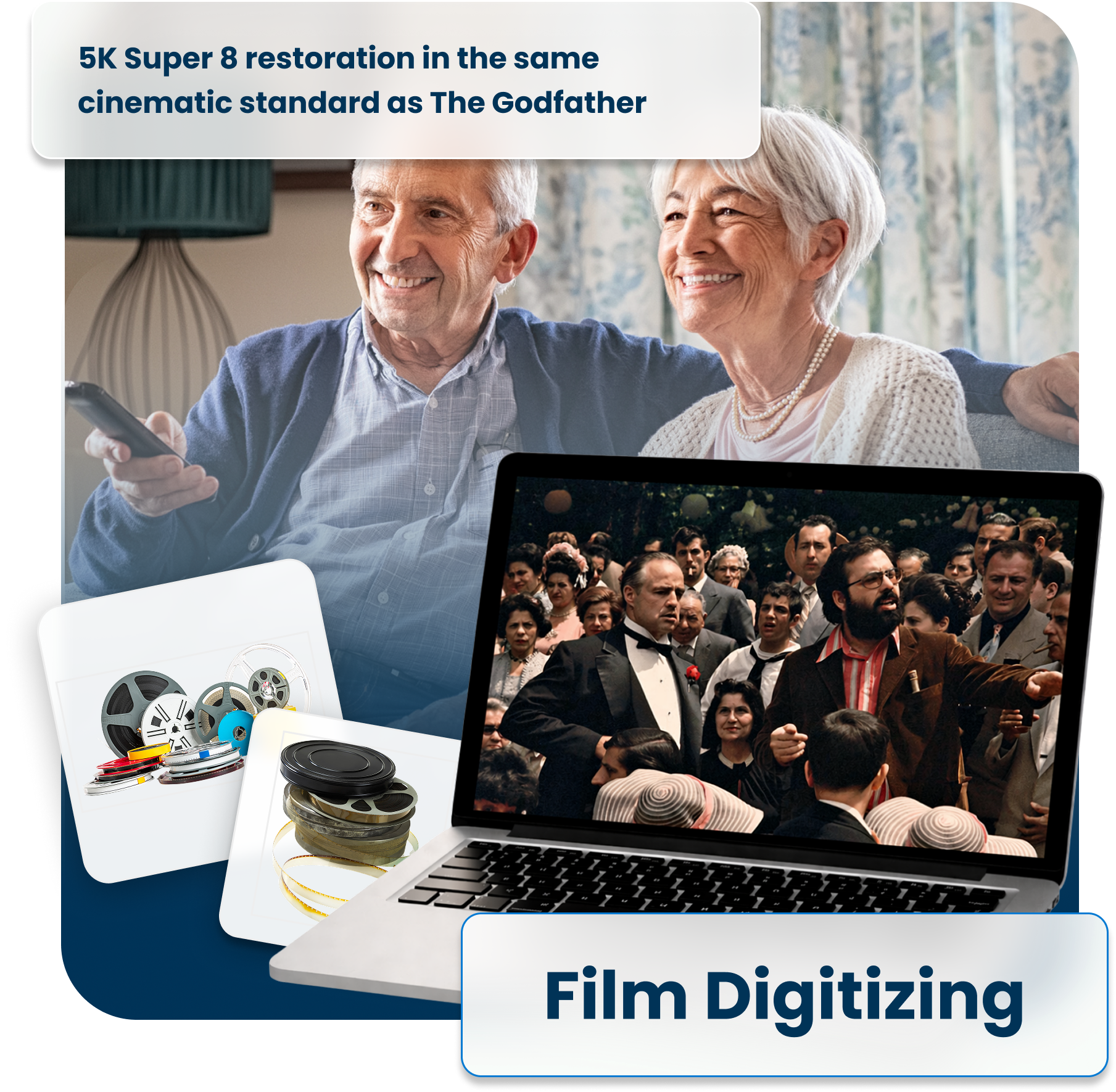 Super 8 is the most beloved home movie format ever made — its warm, cinematic look is unlike anything else. Scan5 digitizes your Super 8 reels frame-by-frame using the same Hollywood-grade technology that restored The Godfather, delivering breathtaking digital transfers that honor your film's original beauty.