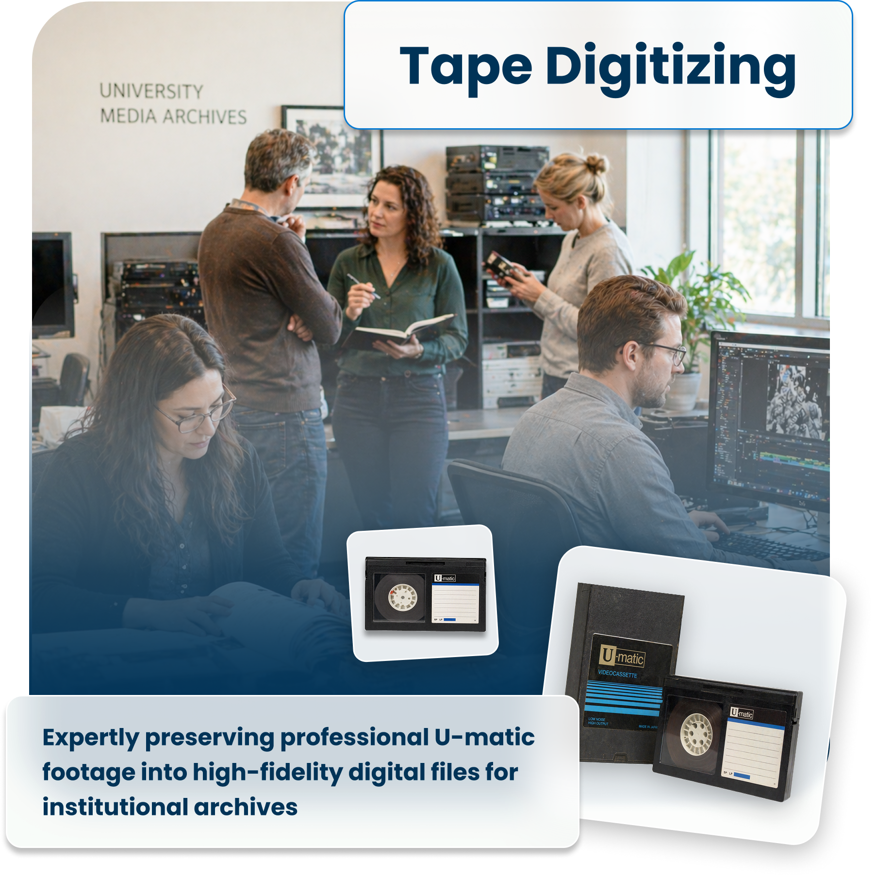 We handle high-volume U-matic transfers for museums, libraries, historical societies, and universities. Contact us to discuss large-scale archival project pricing and logistics.
