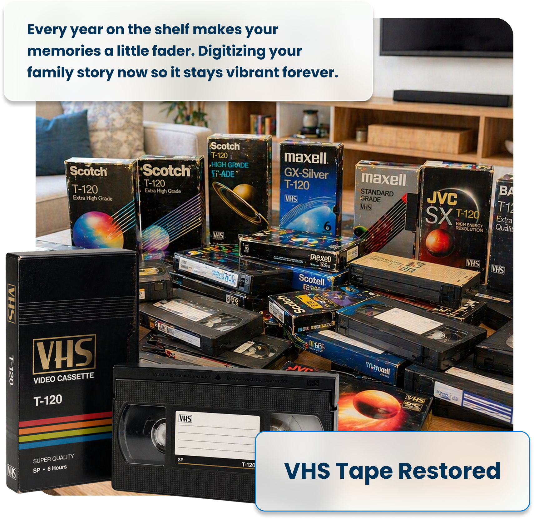 VHS (Video Home System) was the dominant home video format from the early 1980s through the 2000s. Birthdays, holidays, school plays, sports games — millions of family moments were captured on VHS. But magnetic tape degrades with time, especially when exposed to heat, humidity, and repeated playback. Most tapes lose significant quality after 15–25 years.