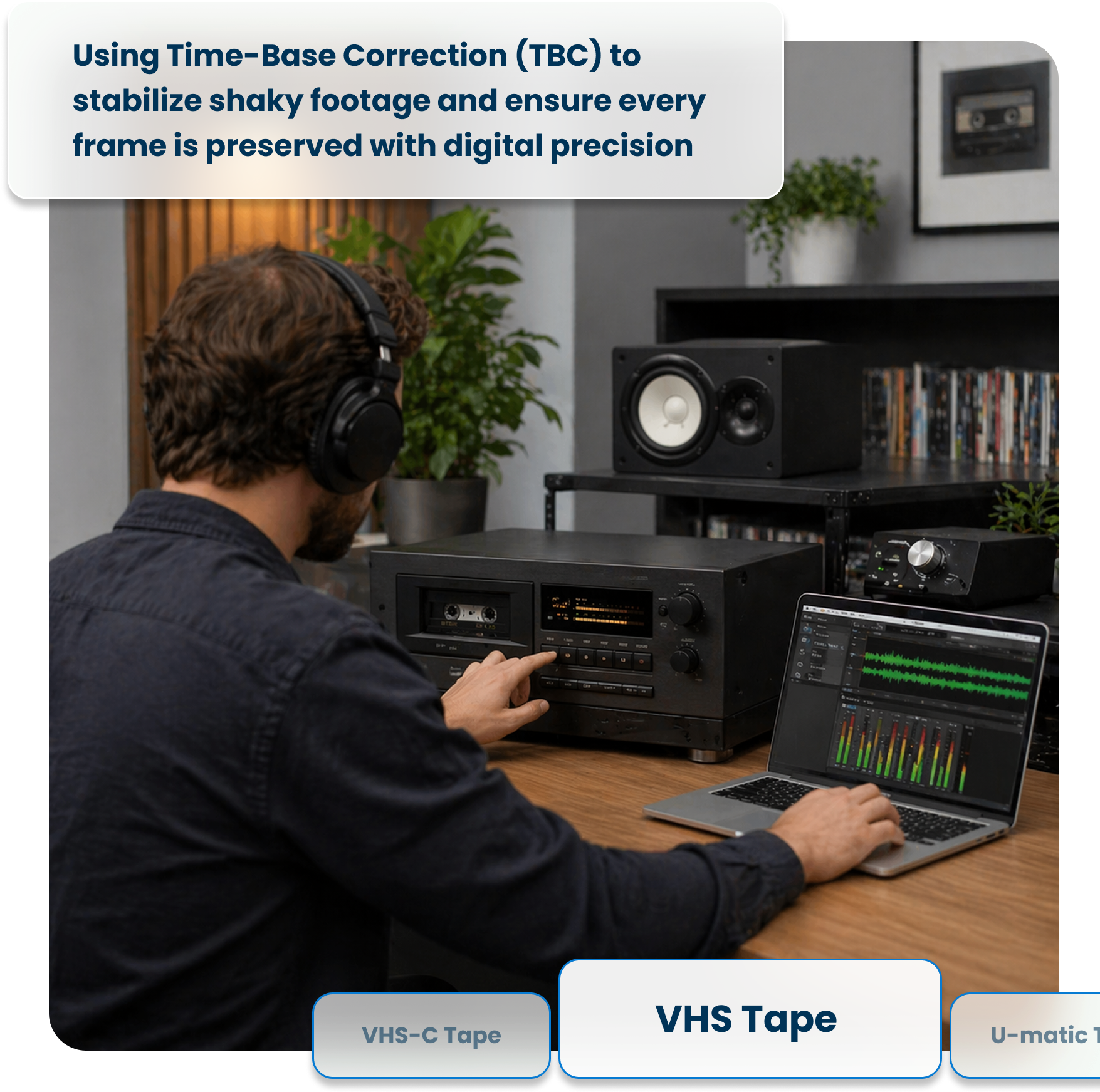 Consumer VHS players struggle to play back degraded tapes reliably, and entry-level capture equipment adds noise and compression that degrades your footage further. At Scan5, we use professional-grade VHS decks paired with time-base correctors (TBCs) and broadcast-quality capture hardware to ensure every frame is transferred faithfully — even from aging or partially damaged tapes.