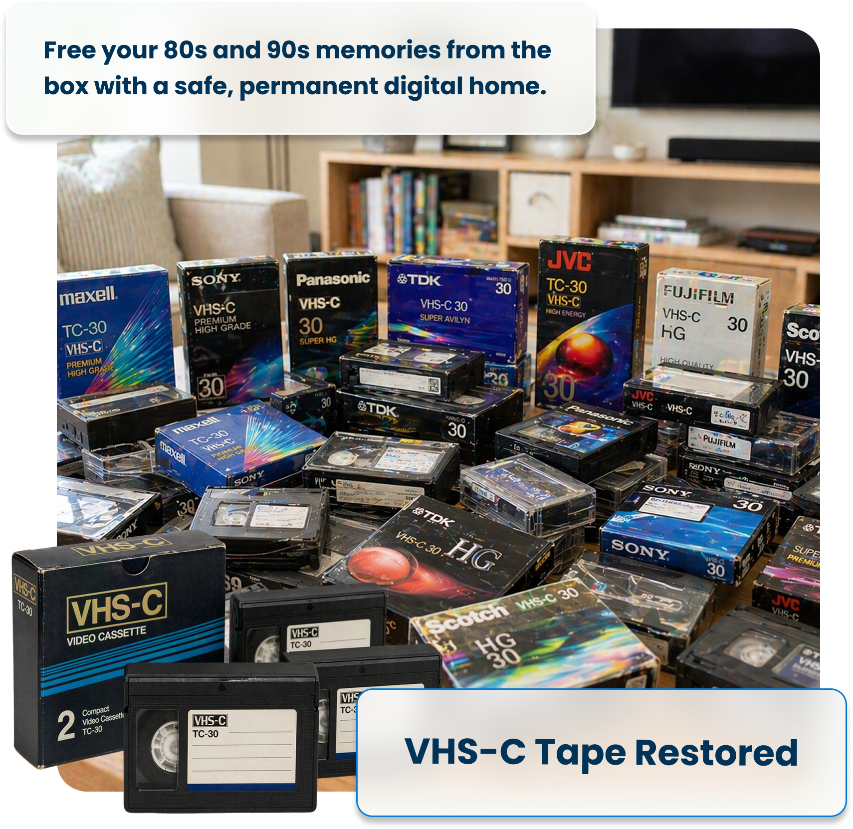 Because VHS-C tapes require a special adapter or deck to play back, many families have boxes of these tapes they can no longer watch. Like all magnetic tape, VHS-C degrades over time — making professional digitization urgent before memories are lost.